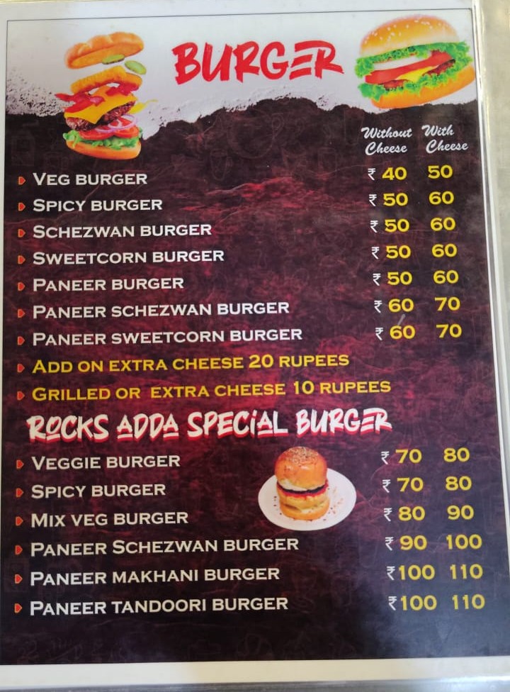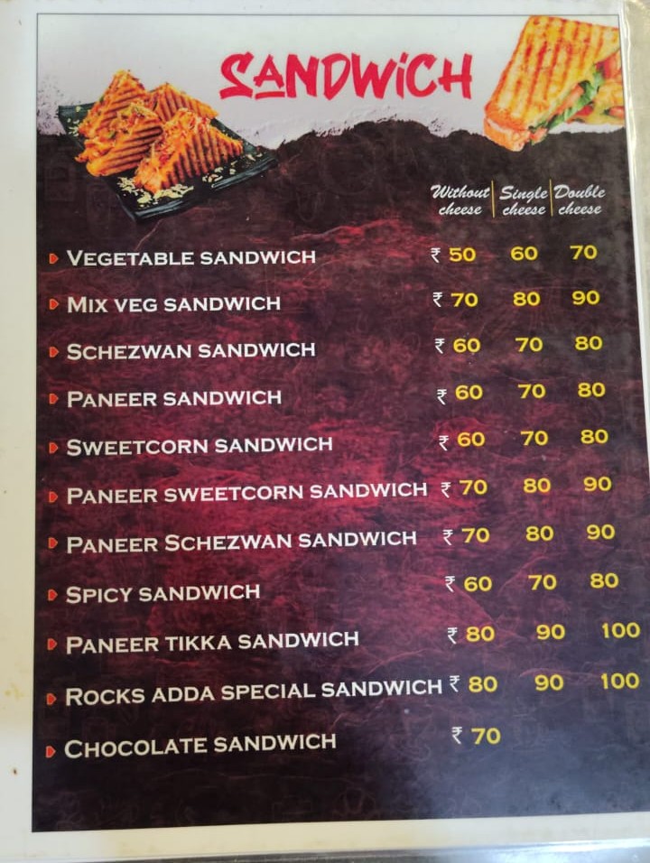 The menu is a cheerful celebration of flavors, featuring a selection of sandwiches that cater to diverse cravings. Whether you're in the mood for the hearty Paneer Sandwich at just ₹60, or the spicy Paneer Schezwan Sandwich for ₹70, every option is crafted to perfection. The Rocks Adda Special Sandwich for ₹80 is not to be missed, offering a unique twist that has customers returning time and time again.
